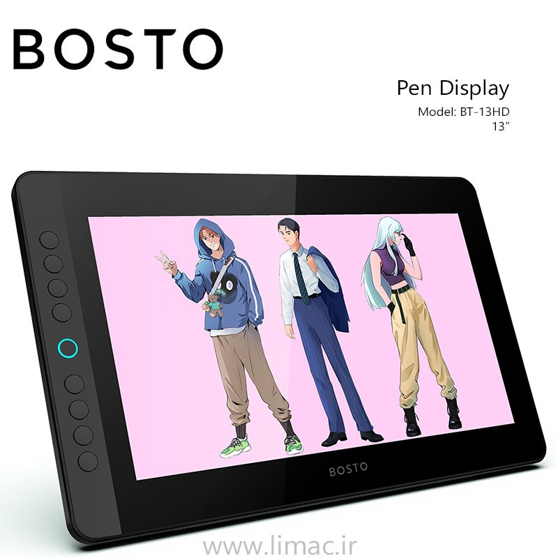 قلم طراحی و نمایشگر BOSTO BT-13HDK دارای صفحه نمایشی لمسی به ابعاد ۱۳.۳ اینچ و با وضوح ۱۰۸۰ × ۱۹۲۰ پیکسل است. مشخصات فنی این قلم طراحی و نمایشگر باعث میشود که این محصول در بالاترین ردهها قرار گیرد. سرعت گزارشدهی موقعیت قلم 300 RPS، شناسایی 8192 LPS (سطوح فشار) و دقت 5080 LPI باعث میشود که کار با قلم طراحی و نمایشگر مطابق با انتظار پیش برود.