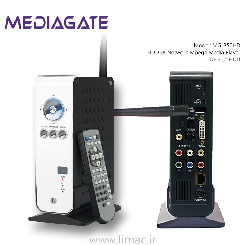 Media Player MG-350 دستگاهی است كه با نصب هارد "IDE 3.5 با هر ظرفيتی در آن به شما اين امكان را میدهد كه از آن به عنوان هارد جانبی، هارد شبكه و پخش كننده تمامی فايلهای تصويری (فيلم با فرمتهای MPEG 1, 2, 4 (MPG, MPEG, AVI, M2V, DAT, VOB, IFO etc.) DivX, XviD (except GMC, Qpel option applied))، صوتی (موزيک با فرمتهای MP3, OGG Vorbis, WAV, WMA (except WMA9 pro.lossless) ) و تصوير با فرمت JPG را برروی تلويزيون، ويدئو پرژكتور و يا هر نمايشگر از روی هارد يا شبكه نمايش دهيد و از تكنولوژی (NDAS (Network Direct Attach Storage بهره برده و بعنوان هارد شبكه استفاده كنيد. قابل استفاده در خانه، آمفی تئاتر، كلاسهای آموزش، هتلها،اتومبيل و...